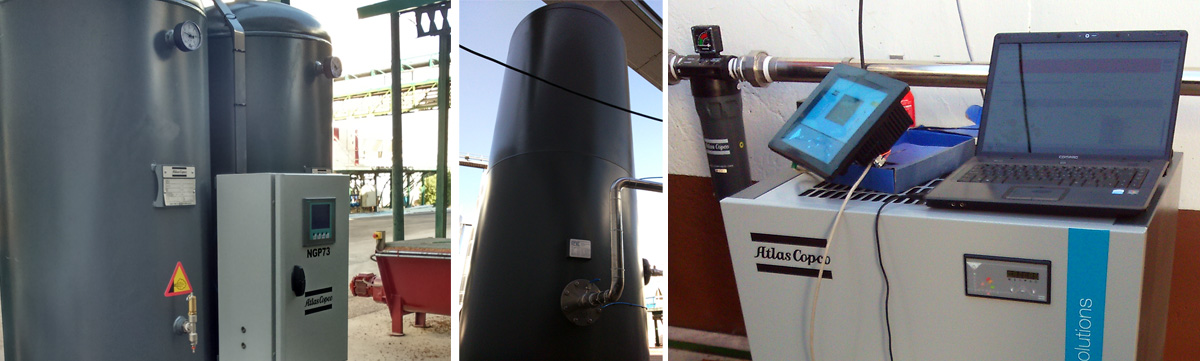 Instalación compuesta por compresor de tornillo con motor de alta frecuencia y velocidad variable de 55 kw, tratamiento de aire (filtros y secador frigorífico), depósito de 30 m3 para aire comprimido presurizado a 10 bar, generador de nitrógeno PSA de 75 m3/h y depósito de 10 m3 para nitrógeno presurizado a 8 bar, apto para su consumo.